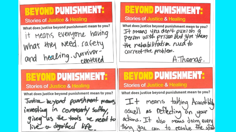 PCC Associate Director Sara Zatz and Kirya Traber met weekly with the Collaborative to discuss the process of using storytelling and theater to activate around JBPC policy pillars. Together, the partners developed wrap-around audience engagement activities to accompany the production. These included tabling spaces for community organizations in the lobby of each performance and designated a quiet reflection space where audience members were invited to respond to the question, “What does justice beyond punishment mean to you?”. Each performance was followed by a talkback with JPBC Collaborative members and Kirya, reflecting on a different pillar of the collaborative’s movement work. Altogether it proved to be a transformative experience for everyone involved. And as one performer reflected, ‘....the single most restorative set of actions we can take is to document and share our stories.’