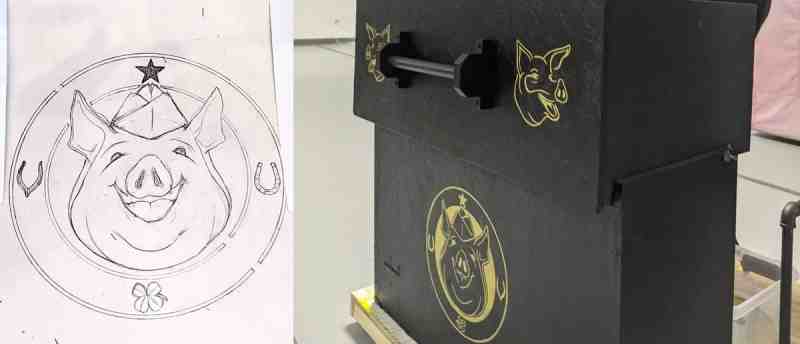 Sunwoo designed the symbol on the left that is painted on the Korean war era U.S. military reed organ in the show, based on the “Lucky Hormel Girl” good luck tokens from the 1950s. The Hormel Girls were a drum and bugle corps of American women veterans after World War II, who traveled across the United States to promote SPAM and other Hormel products. Notice the four symbols for luck surrounding the pig!
